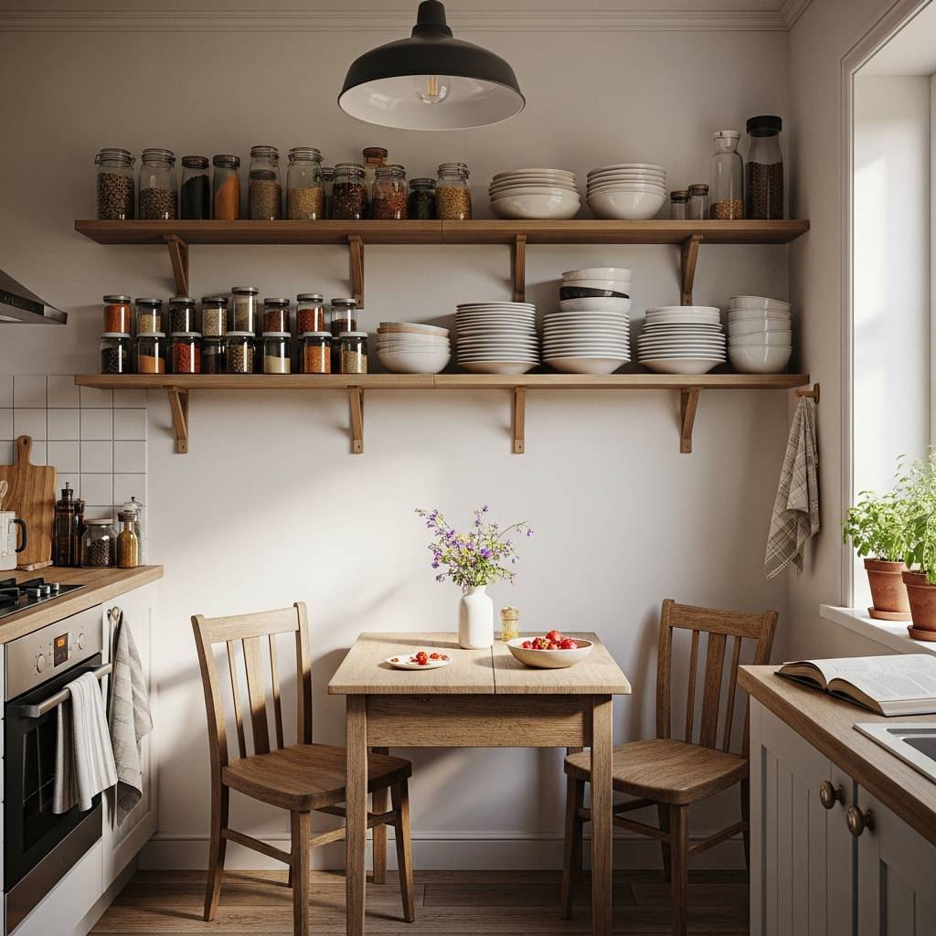Una de las mejores formas de dar amplitud a una cocina pequeña es sustituir los armarios pesados por estantes de madera. Esto no solo permite tener todo a mano, sino que visualmente despeja las paredes. Puedes usar madera recuperada para darle ese toque humilde y rústico que tanto nos gusta. Coloca tus platos favoritos y unos frascos de vidrio con granos para que la decoración sea parte de la utilidad diaria, creando una atmósfera cálida y honesta.