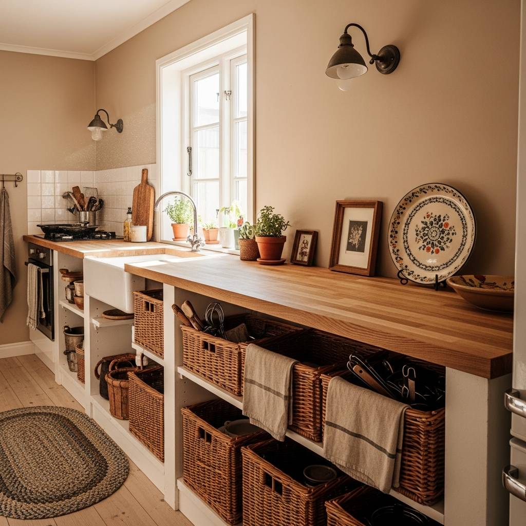 Las cestas de mimbre son perfectas para las cocinas humildes porque son baratas y añaden mucha textura natural. Puedes colocarlas debajo de las mesas o en los estantes más bajos para guardar patatas, cebollas o mantelería. Además de mantener el orden, el mimbre aporta esa sensación de hogar tradicional y artesano que hace que cualquier cocina pequeña se sienta mucho más acogedora y vivida, manteniendo todo en su sitio con mucho estilo.
