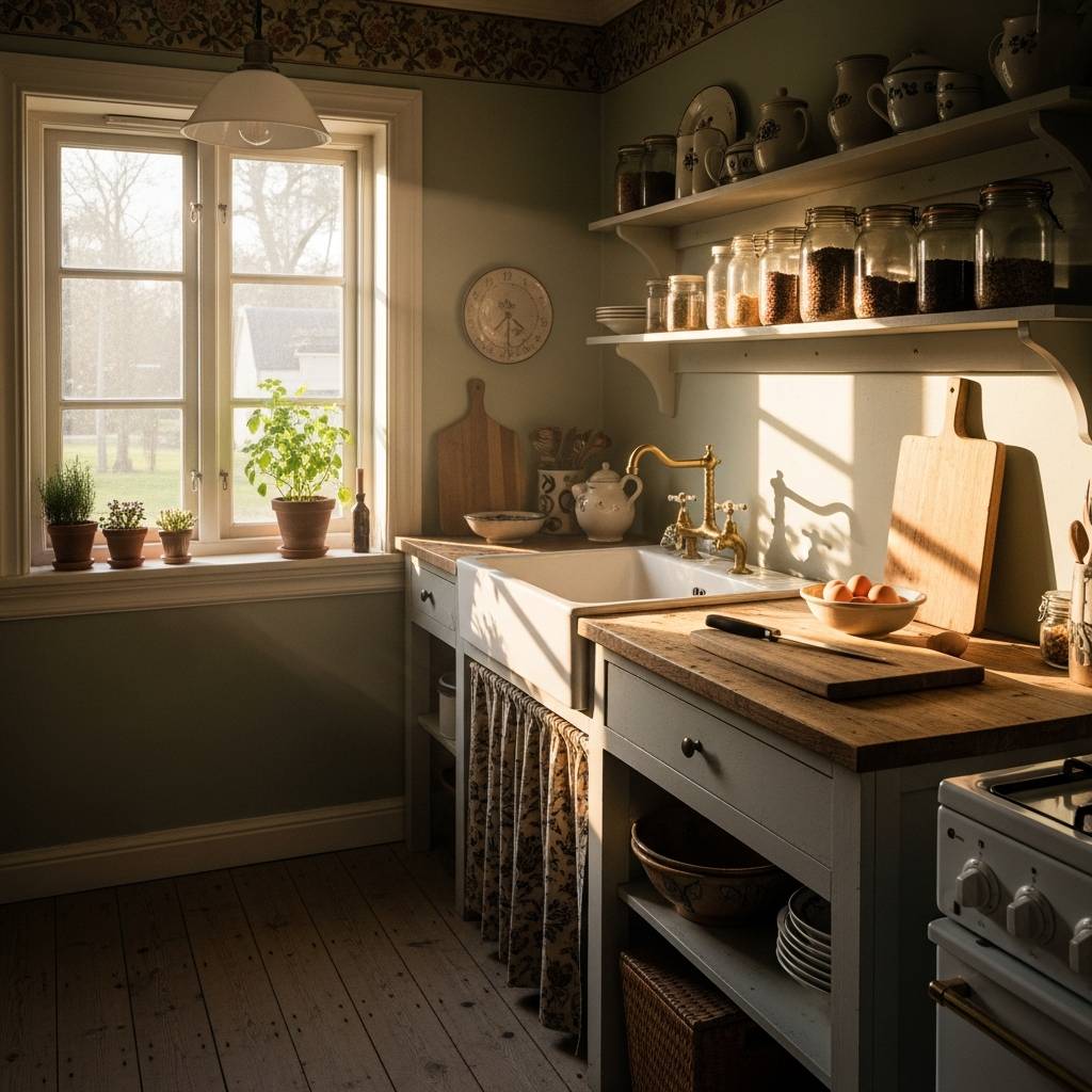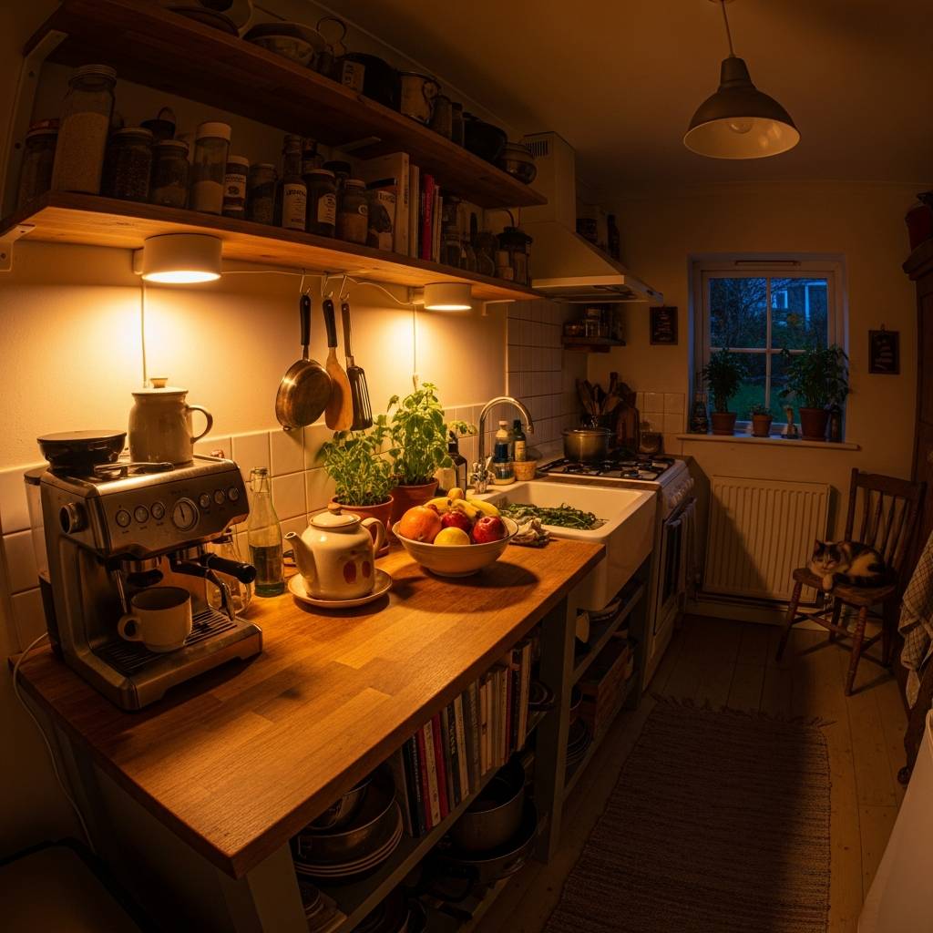 La luz puede cambiar el estado de ánimo de una cocina. En lugar de usar solo una luz blanca fría en el techo, añade una lámpara de pie pequeña sobre la encimera o una guirnalda de luces cálidas sobre los estantes. Esto crea rincones acogedores y hace que el espacio se sienta más tridimensional. En una cocina humilde, la luz cálida resalta las texturas de la madera y los objetos decorativos, haciendo que las cenas sencillas se sientan como momentos especiales.
