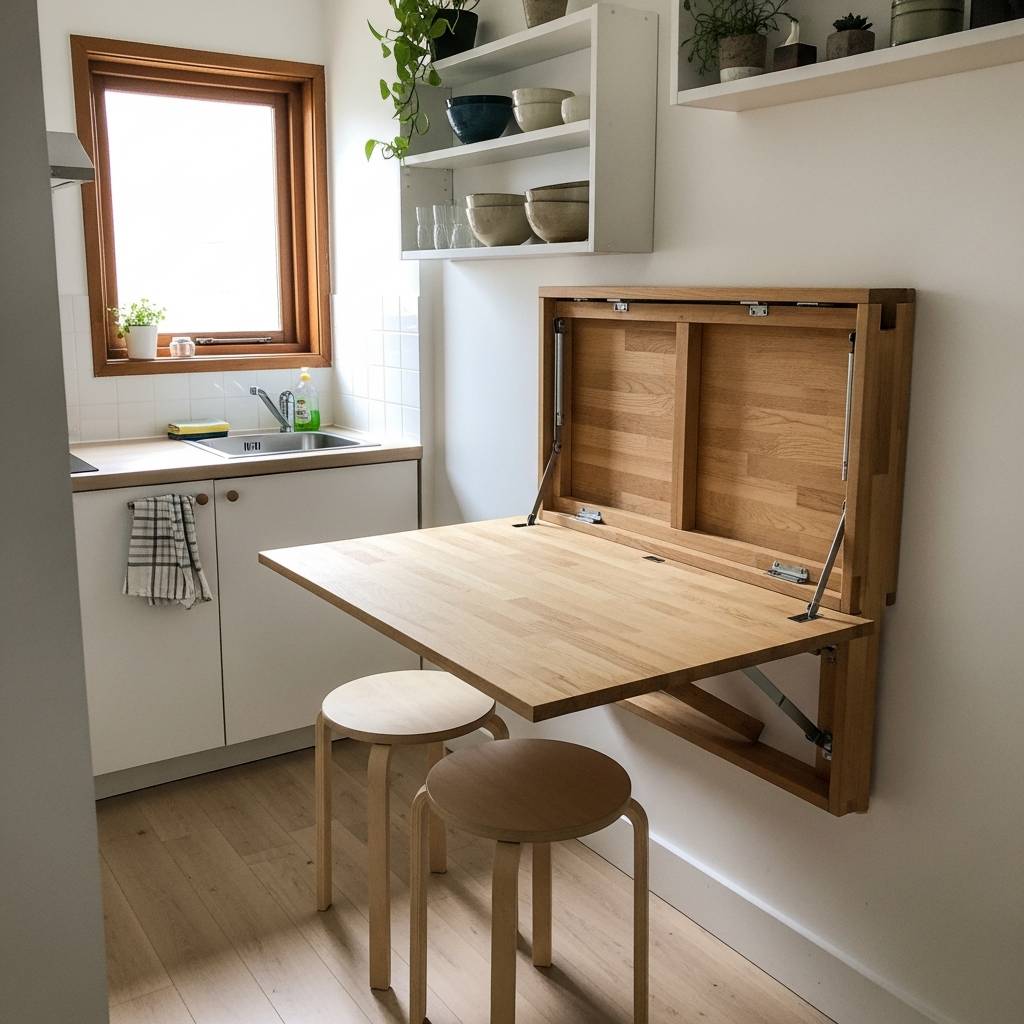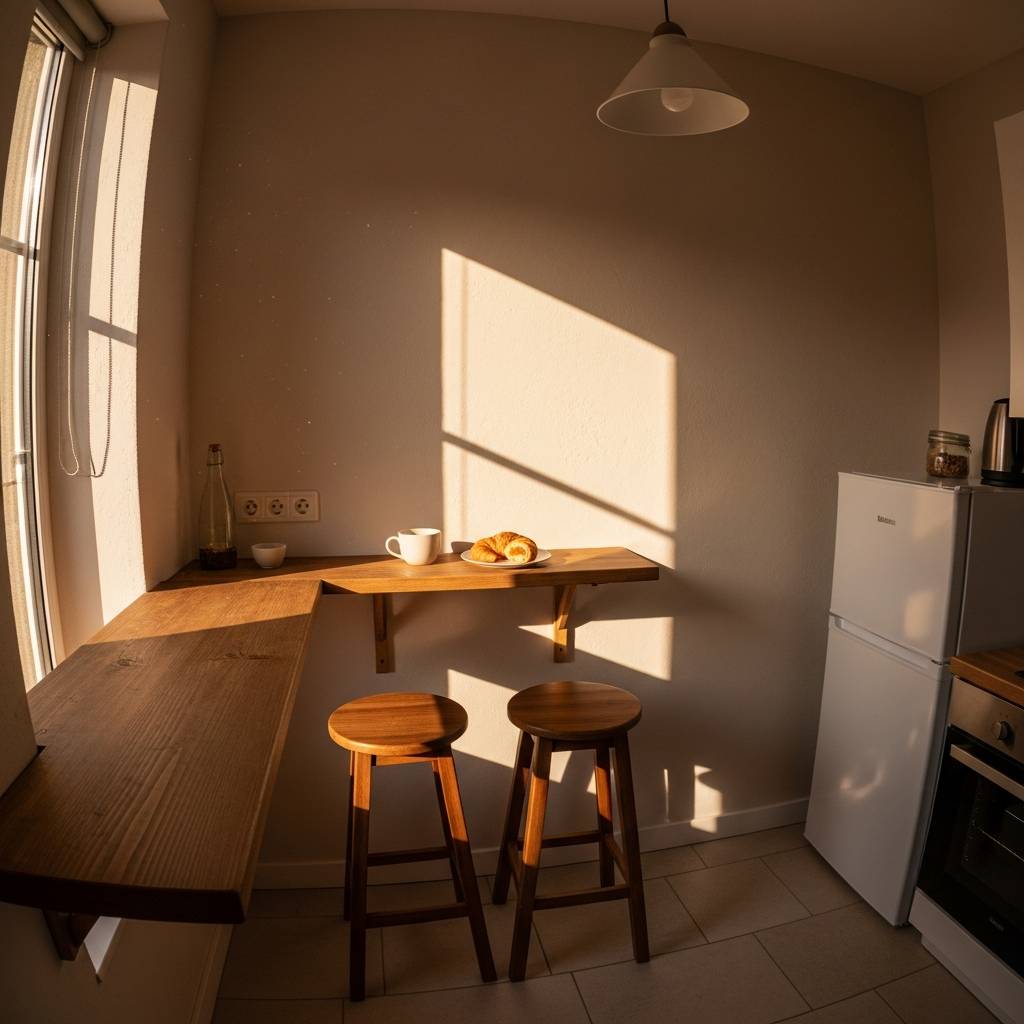 Incluso en la cocina más pequeña se puede disfrutar de un café por la mañana. Una mesa plegable anclada a la pared es la solución ideal; se abre cuando se necesita y se cierra para dejar el paso libre. Combínala con un par de taburetes que quepan debajo y tendrás una zona de comedor funcional sin ocupar espacio permanente. Es un ejemplo perfecto de cómo el ingenio puede hacer que una cocina pequeña sea tan completa como una grande, priorizando la utilidad.