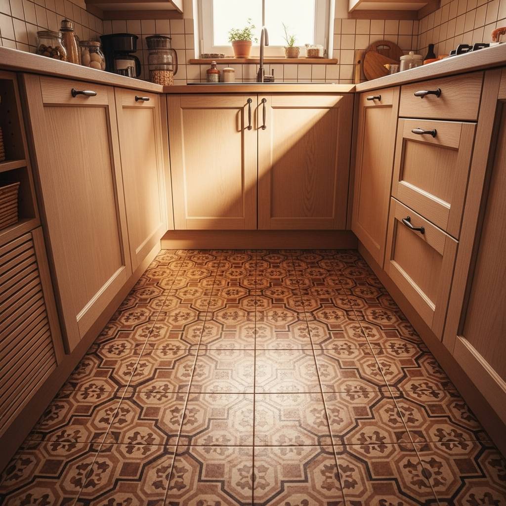 Si el suelo de tu cocina está desgastado pero no puedes permitirte una reforma, el vinilo es tu salvación. Existen diseños que imitan baldosas hidráulicas antiguas que le dan un carácter increíble a las cocinas humildes. Es fácil de limpiar, económico de instalar y cambia por completo la percepción del espacio. Un suelo con personalidad puede ser el centro de atención, desviando la mirada de la falta de metros cuadrados y aportando un toque artístico y retro muy especial.