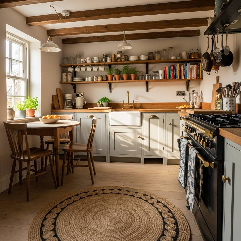 Una alfombra no es solo para el salón. Colocar una pequeña alfombra de yute o algodón lavable frente al fregadero aporta calidez inmediata a la cocina. Ayuda a delimitar el espacio y hace que la zona de trabajo sea mucho más cómoda para los pies. Elige colores naturales o un patrón sencillo que complemente el resto de la decoración humilde. Es un detalle textil que suaviza las superficies duras de la cocina y la hace sentir más como una habitación integrada al hogar.