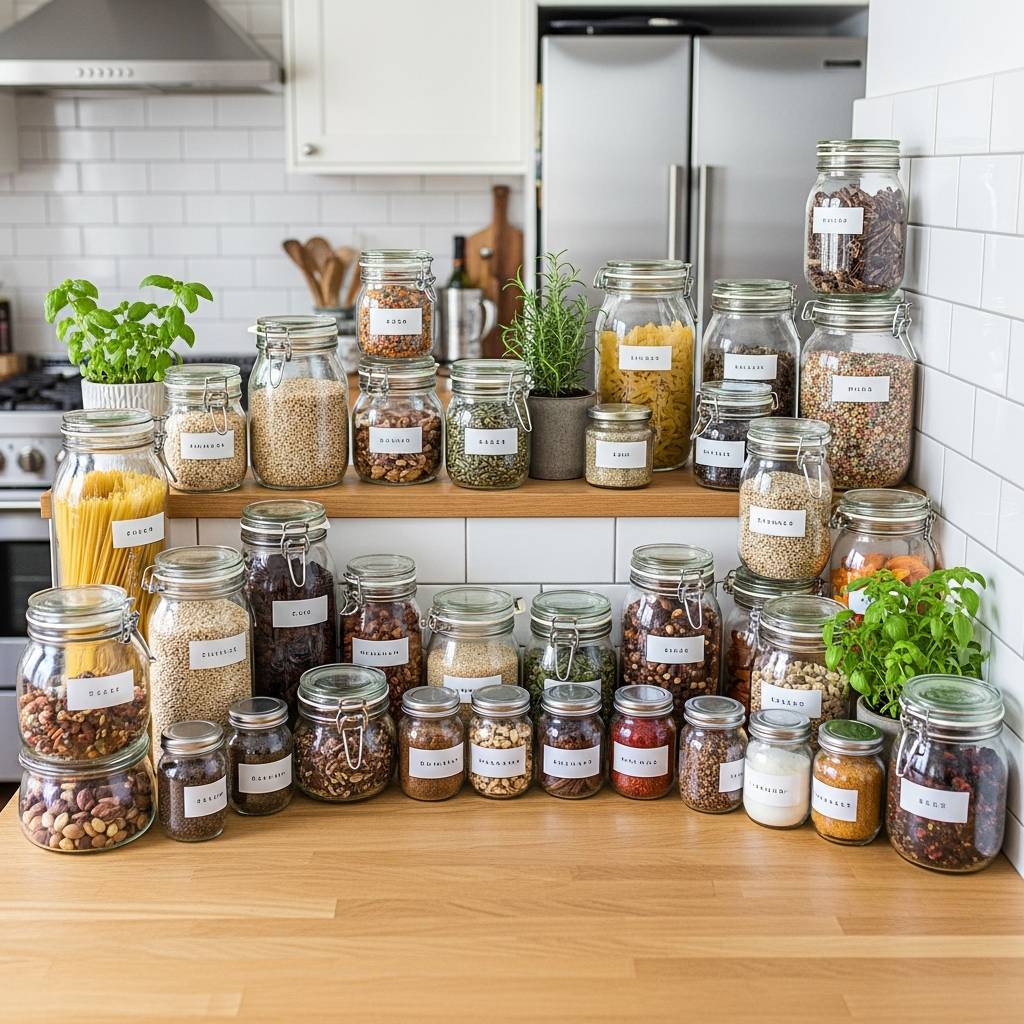La uniformidad visual ayuda a que el espacio se vea más ordenado. En lugar de tener mil paquetes de diferentes colores, utiliza frascos de vidrio transparente para tus especias, pastas y legumbres. Puedes personalizarlos con etiquetas hechas a mano para ese toque humilde y artesano. Al estar a la vista en los estantes, los colores de los propios alimentos sirven como decoración natural, creando una despensa abierta que es un deleite para la vista y muy práctica para cocinar.