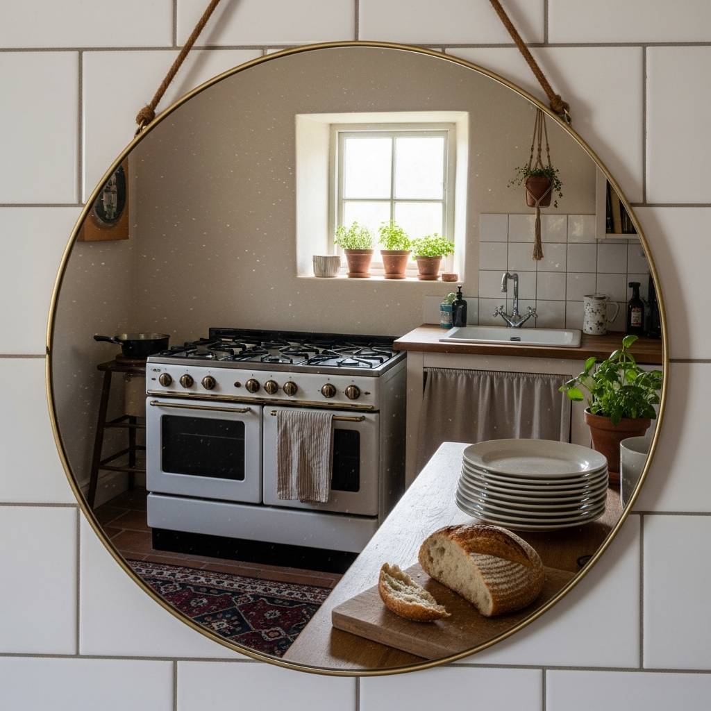 Colocar un espejo en una de las paredes de la cocina puede parecer inusual, pero es un truco fantástico para duplicar visualmente el espacio. Refleja la luz y las otras partes de la habitación, rompiendo la sensación de encierro. Busca un marco de madera sencillo o uno de metal recuperado para que combine con el estilo humilde de la estancia. Es una pieza decorativa que aporta sofisticación y una amplitud sorprendente a las cocinas más pequeñas, sin necesidad de grandes obras.