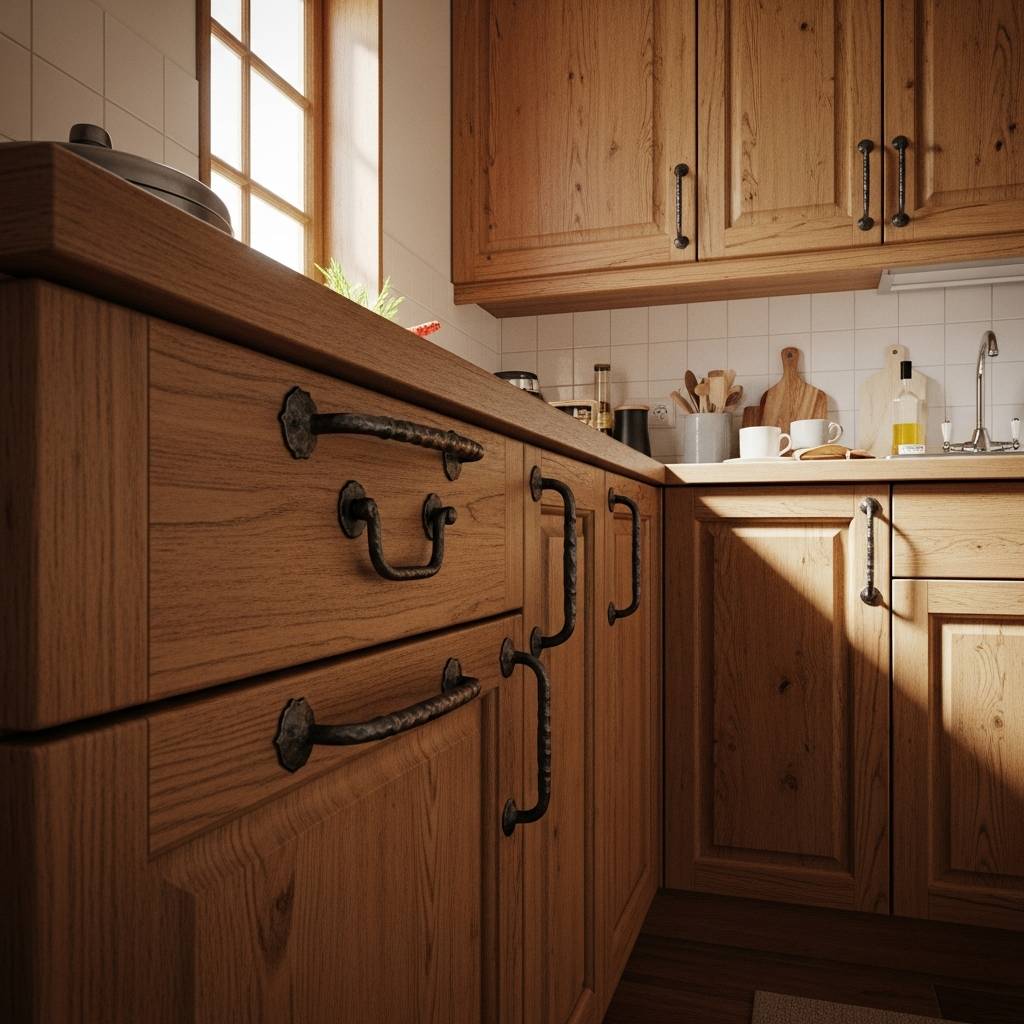 El uso de pequeños accesorios en hierro forjado, como tiradores de puertas o soportes para estantes, da una sensación de solidez y autenticidad. Este material combina de maravilla con la madera y las paredes claras, creando un contraste muy atractivo. Es un recurso común en decoraciones humildes que buscan durabilidad y un estilo clásico que no pasa de moda. Estos pequeños detalles metálicos añaden un carácter industrial suave que hace que la cocina se sienta robusta y con mucha historia.