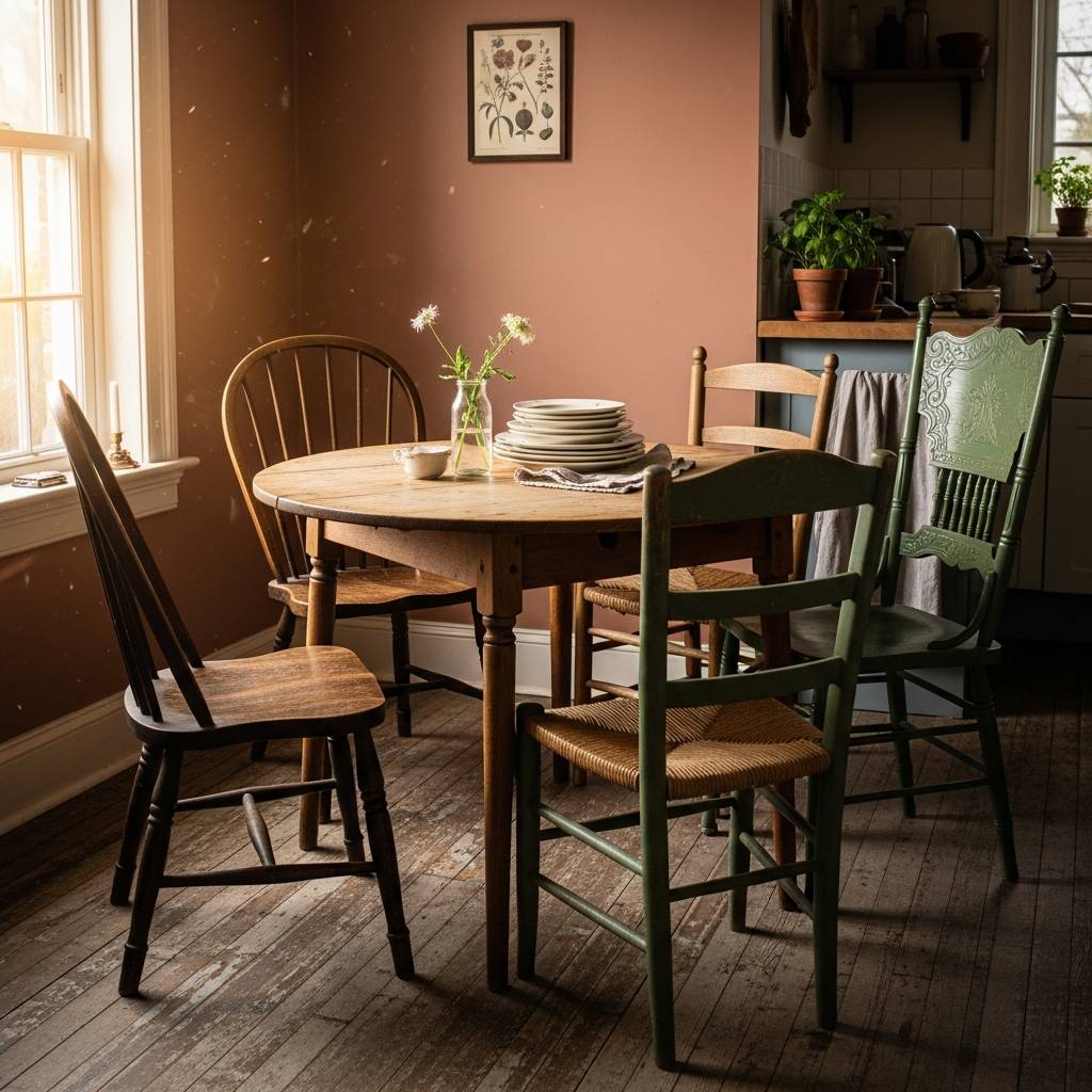 Si tienes espacio para una pequeña mesa, no hace falta que las sillas sean iguales. Recuperar sillas de diferentes estilos y pintarlas del mismo color o dejarlas en su tono natural crea un look bohemio y relajado. Esta mezcla aporta mucha personalidad a las cocinas humildes, demostrando que la imperfección puede ser muy estética. Es una forma excelente de reutilizar muebles y darles una segunda vida, haciendo que tu cocina se sienta única, acogedora y llena de historias familiares.