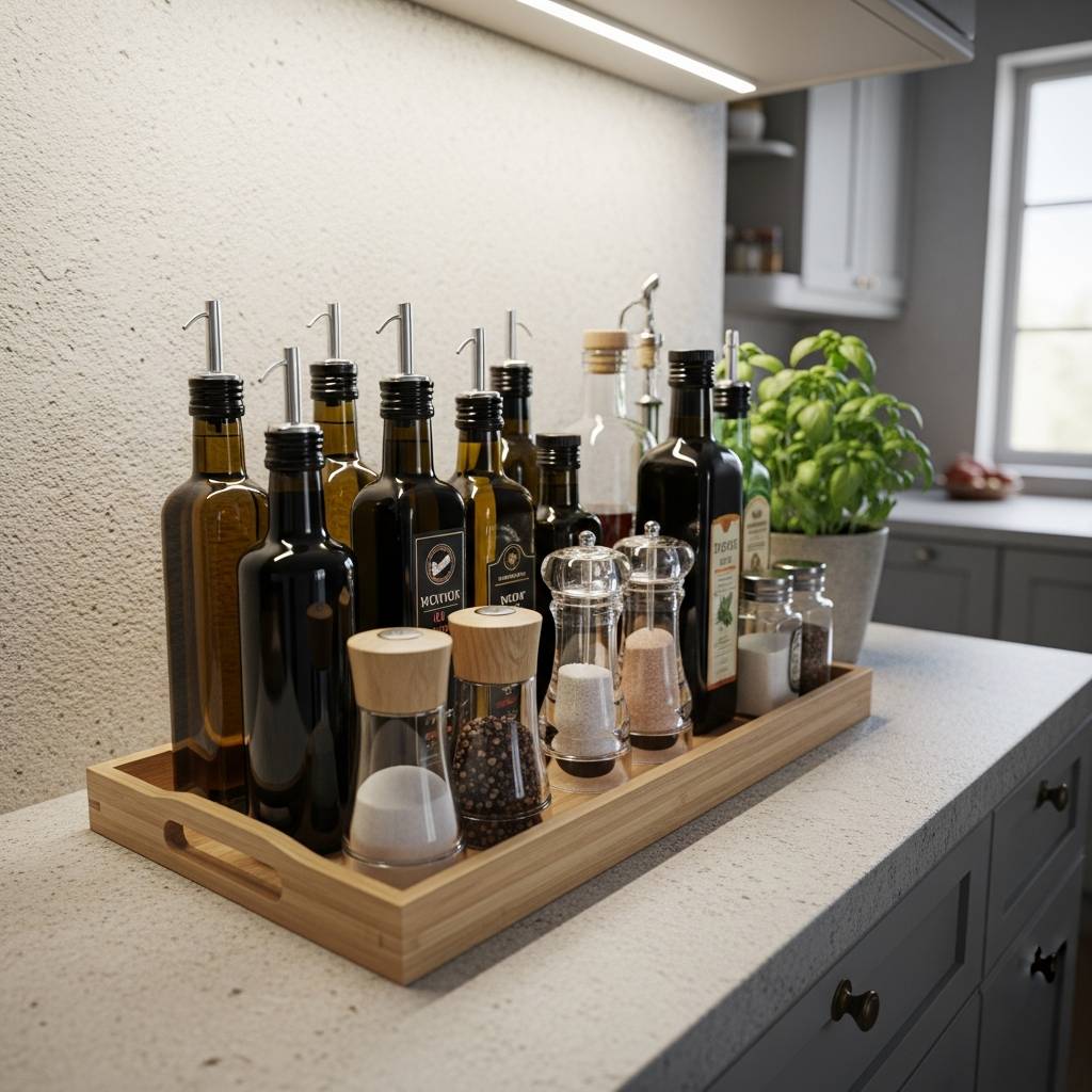 Para evitar que la encimera se vea desordenada, utiliza bandejas de madera o mimbre para agrupar los aceites, la sal y los utensilios de uso diario. Al mantener los objetos dentro de un límite físico, la vista percibe más orden y limpieza. Es un truco decorativo muy humilde pero extremadamente eficaz para mantener el equilibrio en espacios pequeños. Las bandejas añaden una capa extra de textura y hacen que hasta los elementos más cotidianos parezcan parte de una composición cuidada.