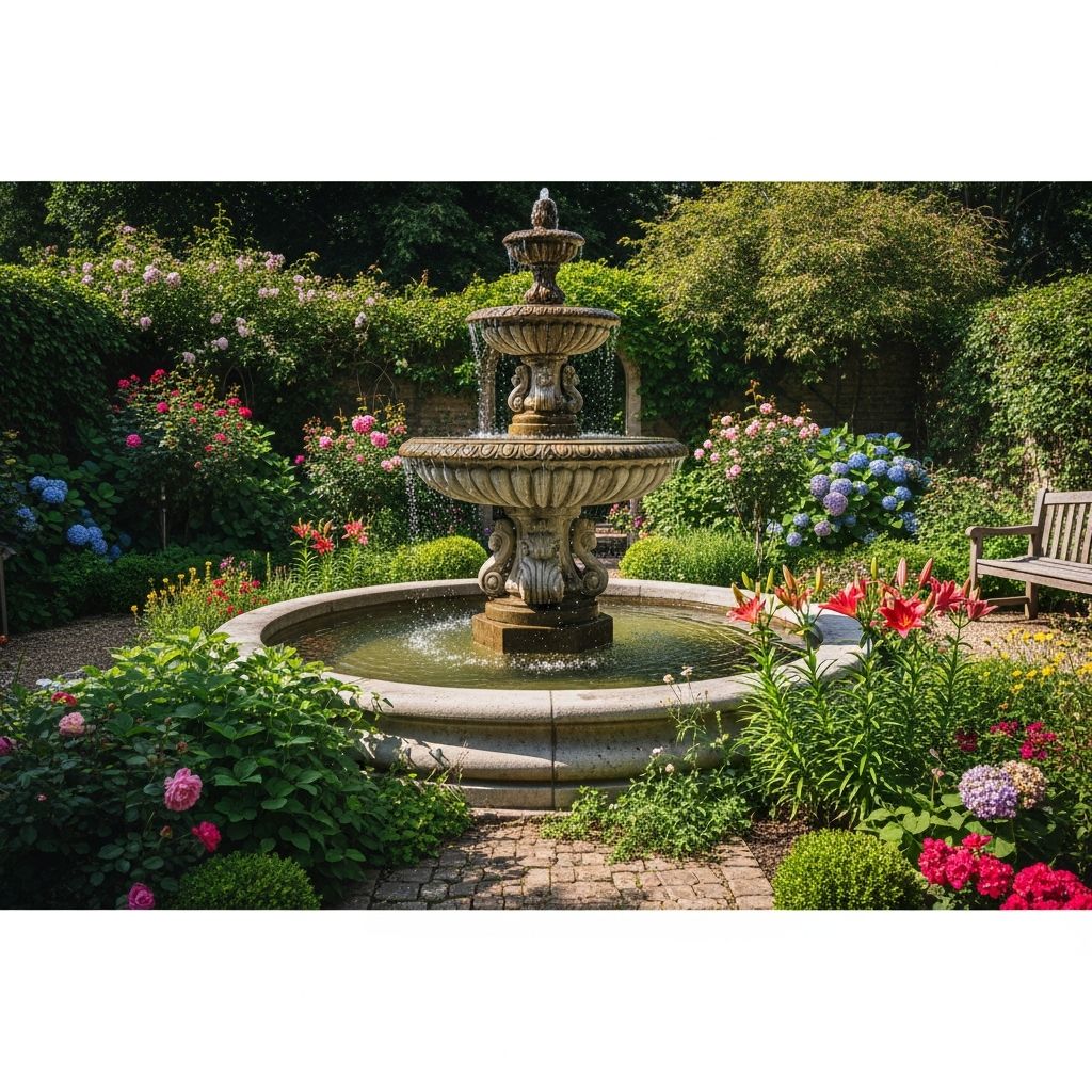 Una fuente de piedra es el corazón de cualquier jardín antiguo. Su suave murmullo no solo aporta una melodía relajante, sino que también crea un punto focal visual impresionante. Busca diseños con querubines, figuras mitológicas o estructuras escalonadas para un toque auténtico.