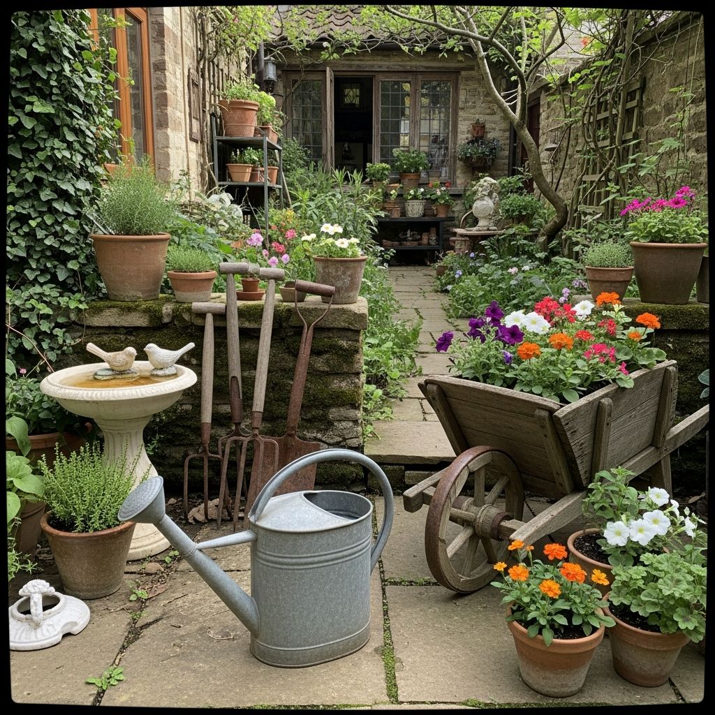 No olvides los pequeños detalles que marcan la diferencia. Una carretilla antigua llena de flores, regaderas de metal envejecido, jaulas de pájaros decorativas (vacías o con plantas), o herramientas de jardín vintage colgadas en la pared.