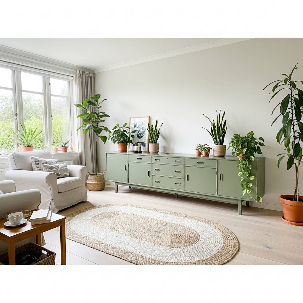 Un aparador de gran tamaño pintado en un suave tono verde salvia se convierte en el protagonista del salón. Este color aporta una sensación de calma y naturaleza, combinando a la perfección con suelos de madera clara y plantas de interior exuberantes. El acabado mate ayuda a disimular imperfecciones de la madera antigua, mientras que los tiradores originales en bronce resaltan la elegancia del mueble.