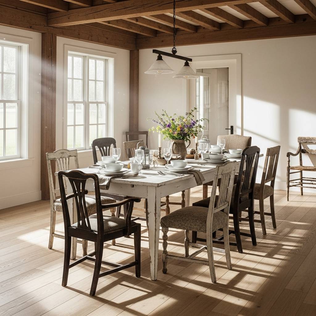 Para un estilo Shabby Chic auténtico, una mesa de comedor robusta pintada en blanco roto y luego decapada es la elección ideal. El proceso de lijado suave en las esquinas y bordes revela la madera original, dando un aspecto vivido y acogedor. Rodeada de sillas de diferentes estilos, esta mesa invita a largas cenas familiares en un ambiente relajado y rústico.