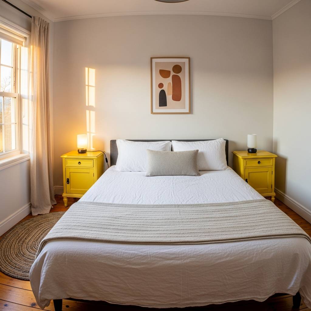 Para los que no temen al color, unas mesitas de noche en amarillo mostaza pueden iluminar instantáneamente un dormitorio oscuro. El amarillo aporta energía y modernidad a las formas curvas de los muebles vintage. Al ser piezas pequeñas, permiten experimentar con colores atrevidos sin saturar el espacio, creando un contraste vibrante con paredes grises o azules.