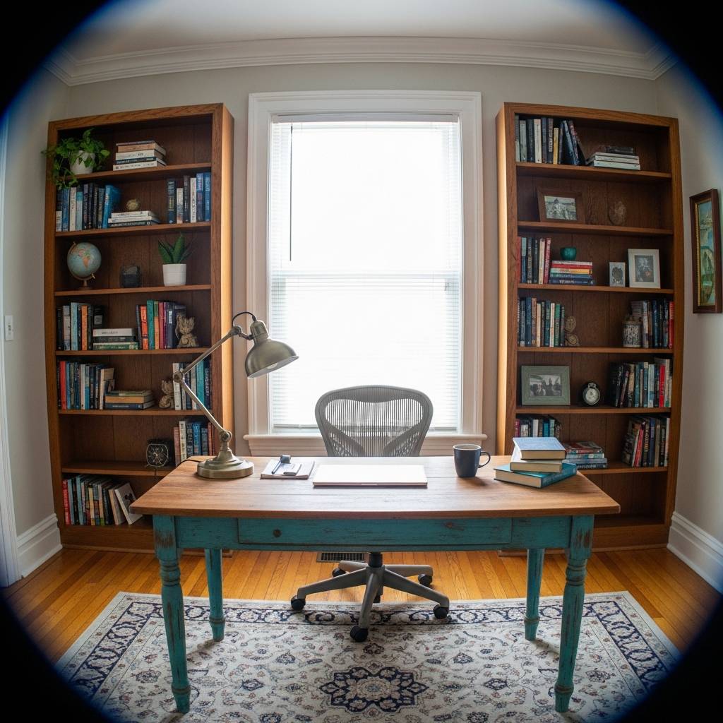 Un escritorio antiguo recuperado con una combinación de pintura azul turquesa en la estructura y el sobre de madera natural barnizada. Esta mezcla resalta la belleza de las vetas de la madera mientras añade un toque de frescura. Es perfecto para crear un rincón de trabajo en casa que inspire creatividad y orden, rodeado de accesorios de oficina modernos.