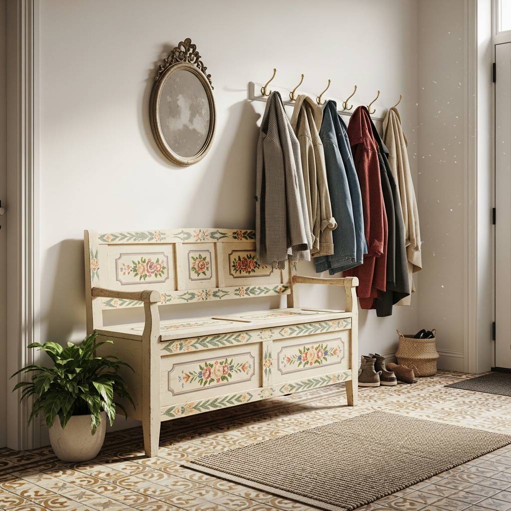 Un banco de entrada sencillo se convierte en una pieza única si se pinta de un color base neutro y se añaden motivos florales o geométricos a mano o con stencil. Este mueble no solo es práctico para descalzarse, sino que recibe a tus invitados con un mensaje de creatividad y cuidado artesanal desde el primer paso dentro de la casa.
