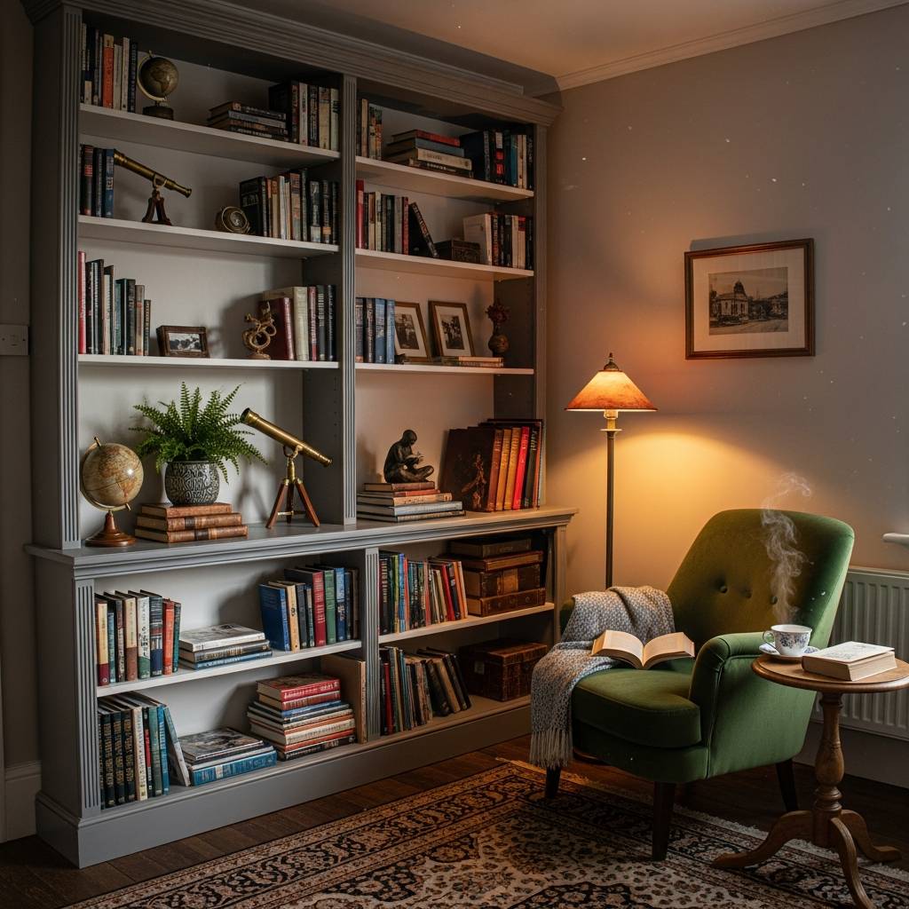 Actualiza una estantería clásica pintando el exterior en un gris piedra y el fondo de los estantes en un blanco puro. Este efecto bicolor añade profundidad visual y hace que los libros y objetos decorativos resalten mucho más. Es una solución elegante que se adapta tanto a salones formales como a dormitorios juveniles.