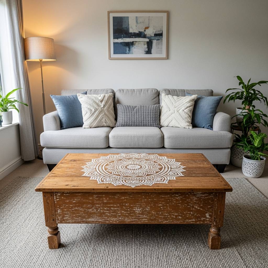 Una mesa de centro de madera oscura puede ganar una nueva vida con un gran mandala pintado en blanco en la parte superior. El uso de plantillas (stencils) permite obtener un acabado profesional. Esta pieza aporta un toque bohemio y relajado al salón, funcionando especialmente bien sobre una alfombra de fibras naturales como el yute.
