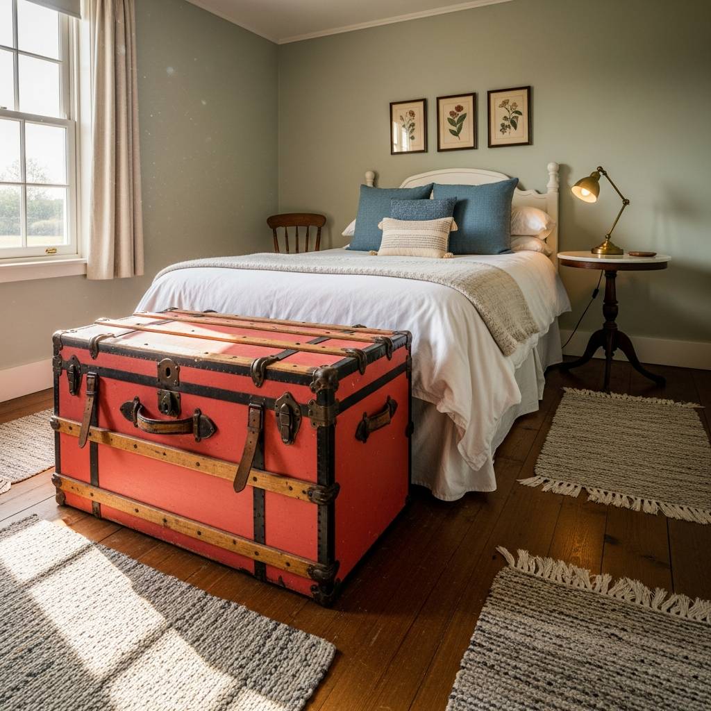 Usa un baúl antiguo pintado en rojo coral como mesa auxiliar o pie de cama. El rojo coral es un color lleno de vida que rompe la monotonía de los tonos neutros. Los herrajes originales en hierro negro contrastan con el color vibrante, manteniendo el espíritu histórico del objeto pero con una apariencia renovada y audaz.