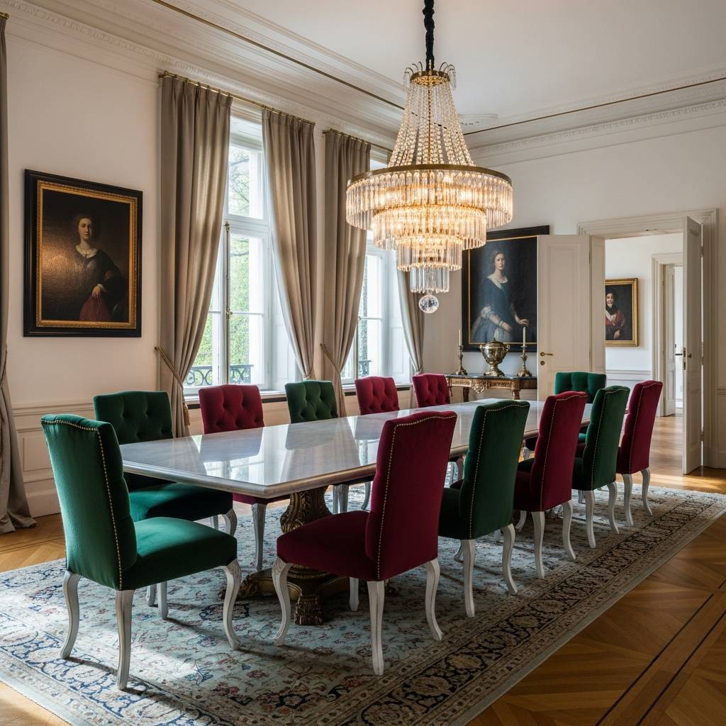 Si tienes sillas vintage con estructura de madera y asiento de terciopelo, prueba a pintar solo las patas y el marco en un tono dorado metálico. Esto eleva instantáneamente el diseño, dándoles un aire de mobiliario de alta gama tipo ‘Hollywood Regency’. Es una forma sencilla de añadir glamour a tu comedor sin cambiar todo el mobiliario.
