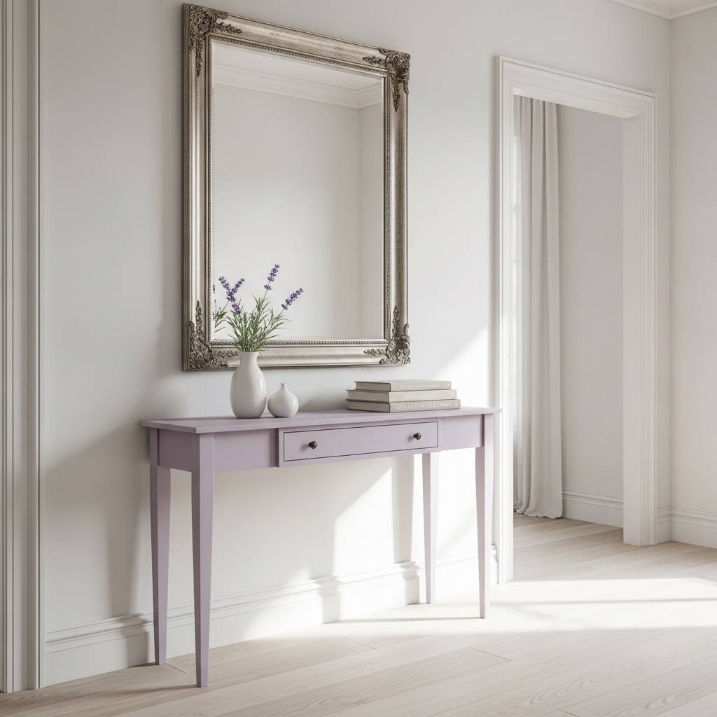 Recibe a tus visitas con la delicadeza de una consola pintada en lavanda. Este color es poco común pero extremadamente relajante y sofisticado. Al ser una pieza estrecha, encaja perfectamente en pasillos o entradas pequeñas, aportando un toque de color sin abrumar el espacio visualmente.