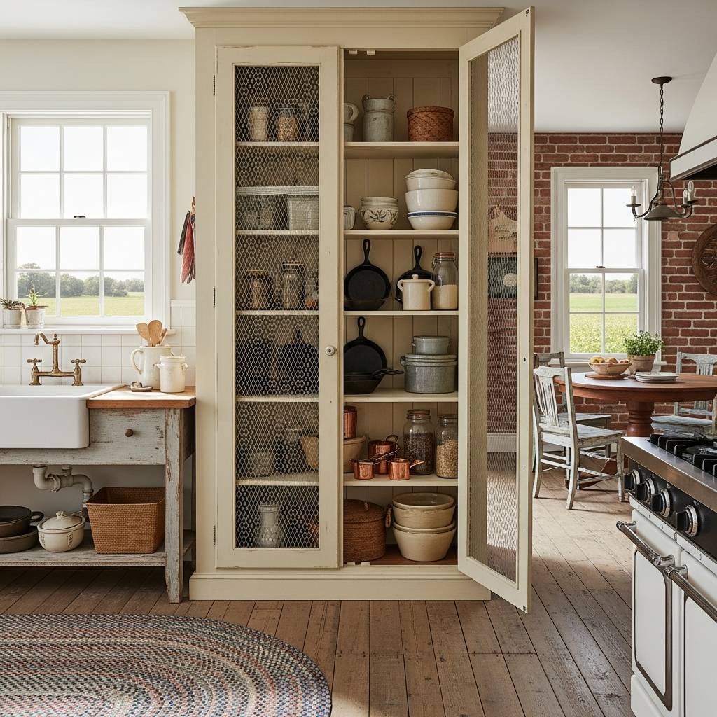 Si tienes un armario antiguo con puertas de rejilla o gallinero, píntalo en un crema suave o gris pálido. La rejilla pintada añade una textura visual única y permite entrever el interior sin mostrarlo todo. Es ideal para una cocina de estilo provenzal que busca un equilibrio entre lo rústico y lo refinado.