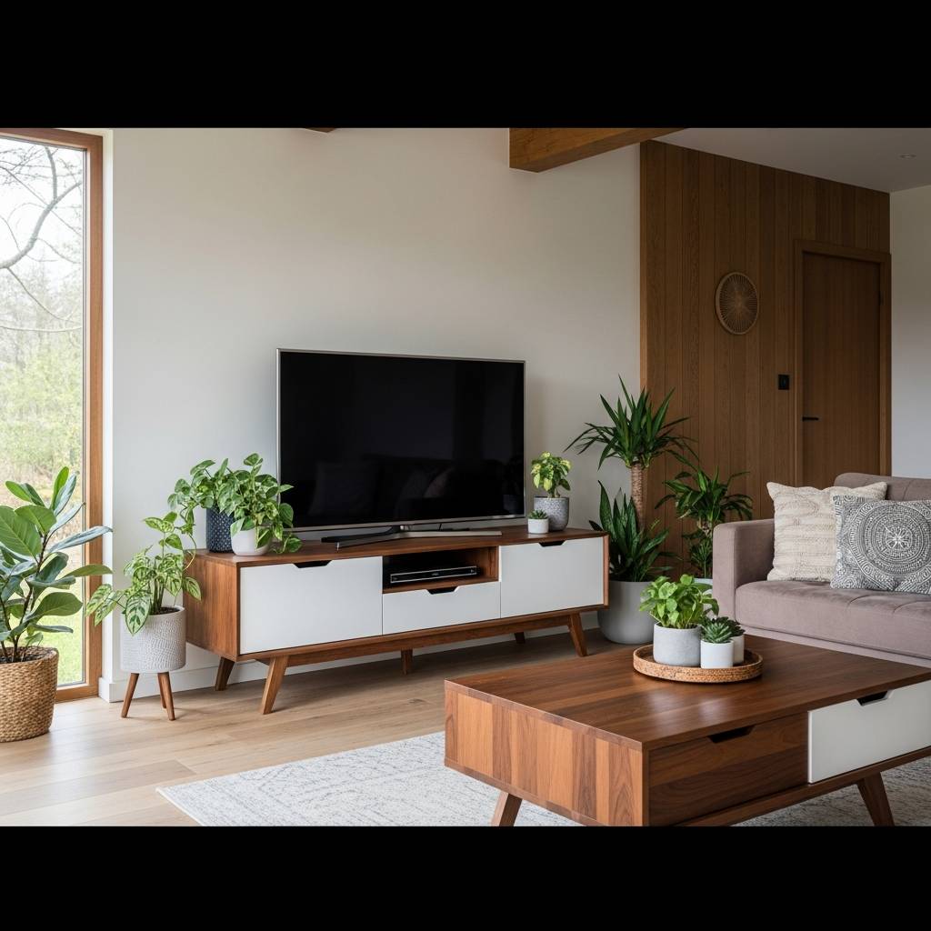 19. Mueble de TV Estilo Mid-Century con Toques Blancos