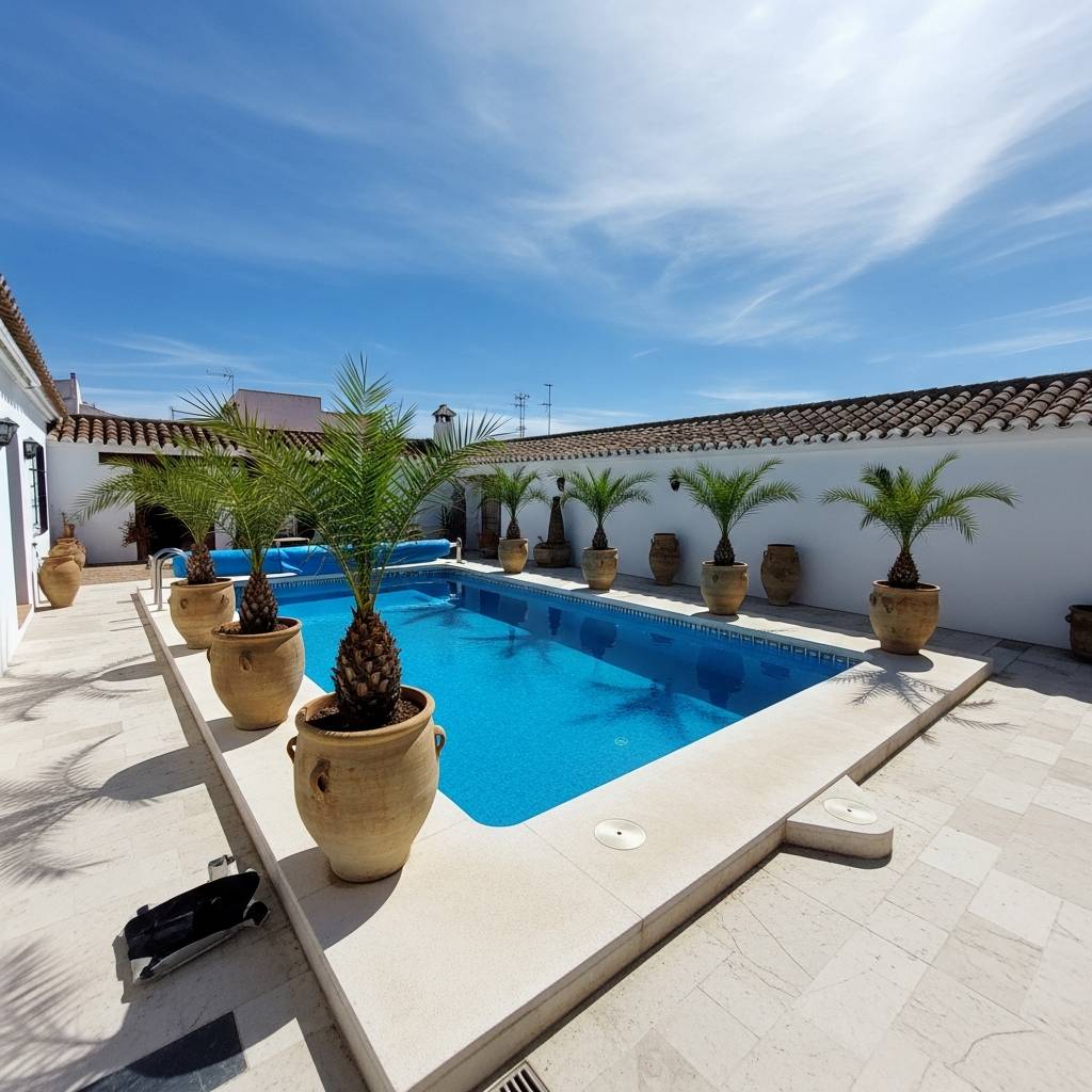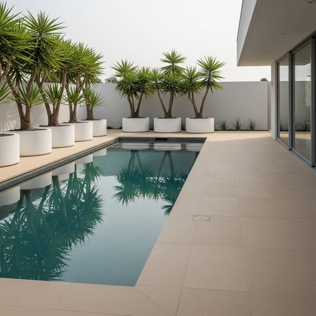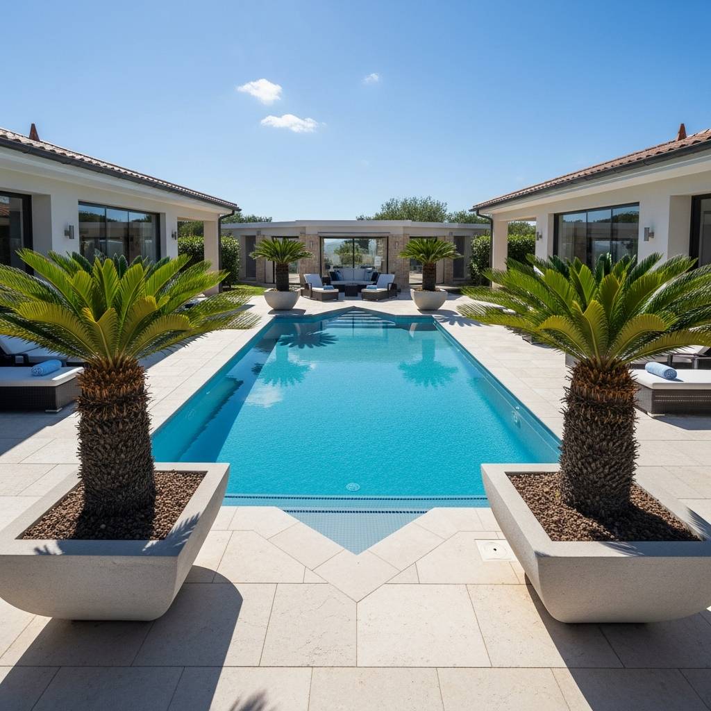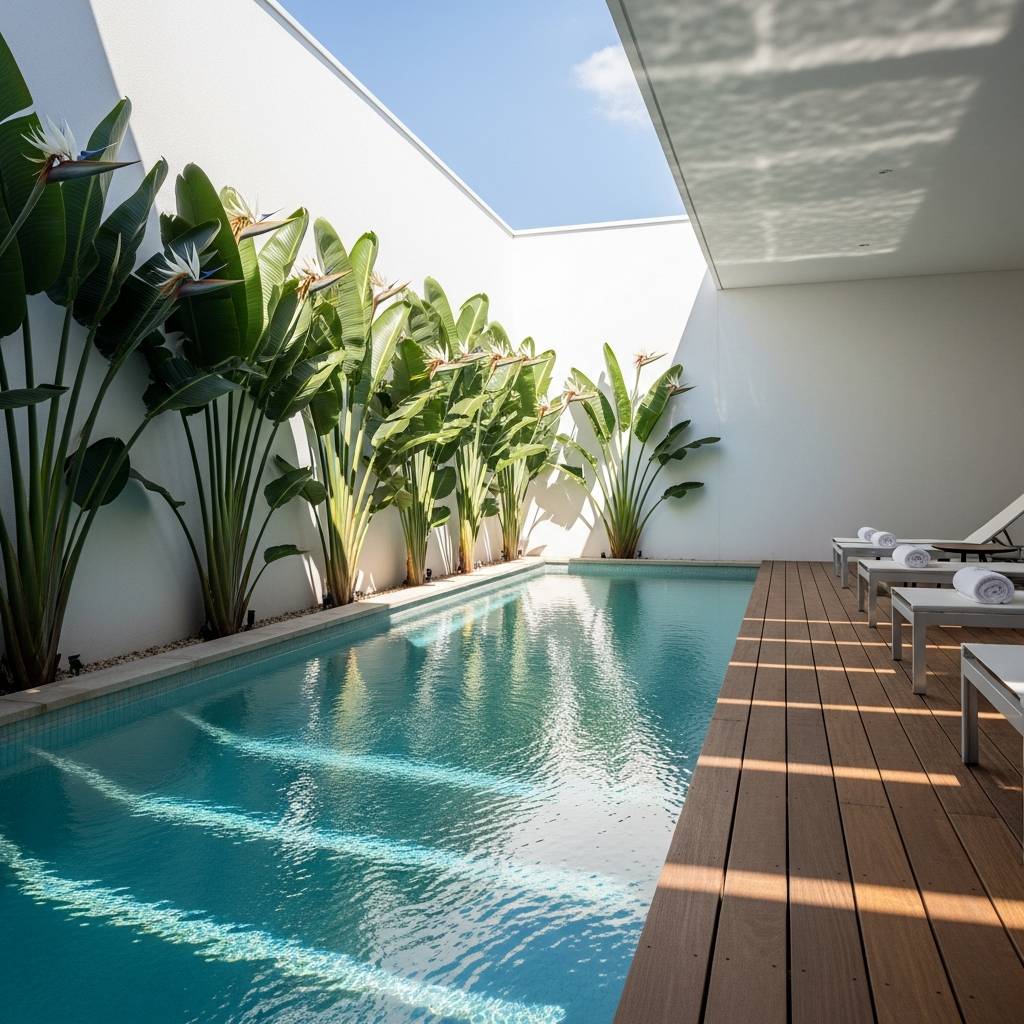 Me encanta cómo lucen las palmeras tipo Phoenix roebelenii justo al borde de la piscina. En muchas casas de Valencia, las veo plantadas en macetones de barro o directamente en el suelo rodeadas de grava blanca. Son ideales porque no crecen demasiado, no ensucian mucho el agua con sus hojas y aportan esa silueta exótica que nos transporta inmediatamente de vacaciones sin movernos de casa.