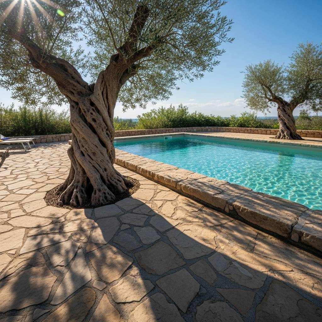 Un olivo cerca de la piscina es un clásico que nunca falla en el paisaje español. Aporto mucha personalidad y sombra ligera si se sabe ubicar. Lo ideal es dejar una zona de césped o piedra alrededor de su tronco para que sus raíces respiren. Ver el reflejo de sus hojas plateadas en el agua cristalina es una de mis estampas favoritas de los veranos en Andalucía o Extremadura.