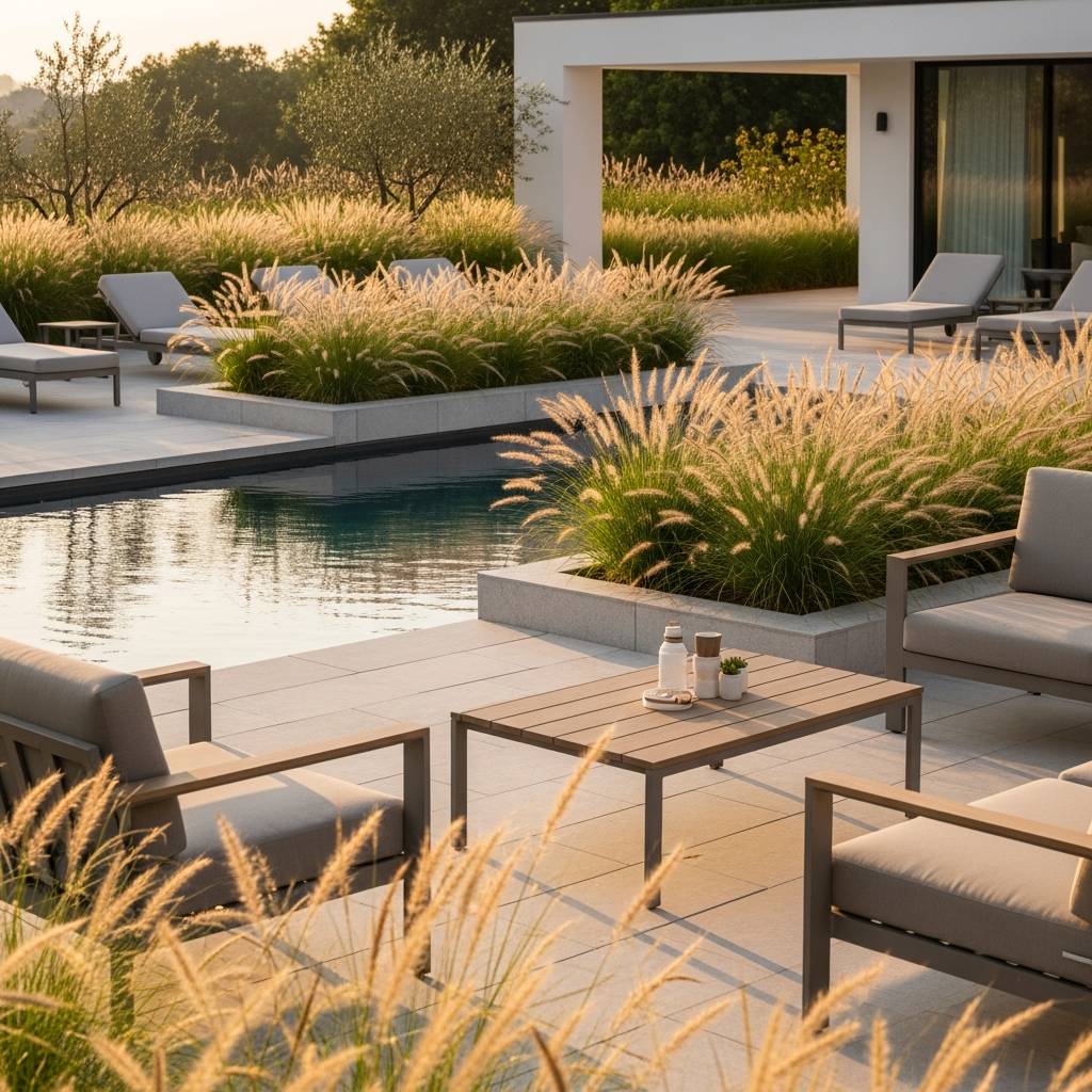 Las gramíneas como el Pennisetum son perfectas si prefieres un estilo más silvestre y contemporáneo. Me fascina cómo sus espigas se balancean con el viento. Son plantas muy sufridas que aguantan perfectamente el sol de justicia del verano español. Quedan geniales si las plantas en macizos densos justo detrás de las tumbonas, creando una separación visual suave entre la zona de nado y el resto del jardín.