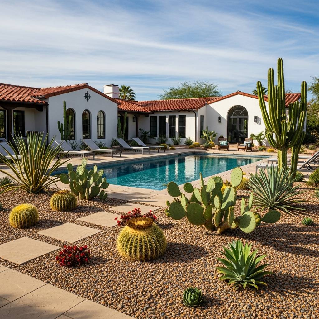 Si no quieres dedicarle mucho tiempo al riego, un jardín de cactus alrededor de la piscina es una opción súper chic. En zonas de Almería o Murcia, donde el agua es escasa, esta tendencia es ganadora. Puedes combinar diferentes alturas de cactus columnares con suculentas bajas. El truco es usar gravilla decorativa de distintos tonos para resaltar las formas geométricas de las plantas.