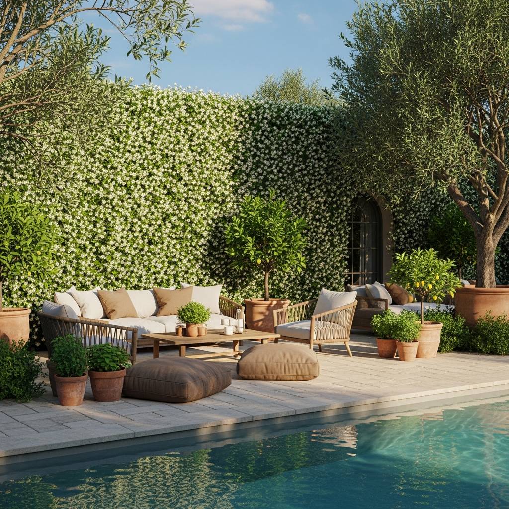 El Trachelospermum jasminoides es una de mis recomendaciones favoritas. Es una trepadora de hoja perenne que en primavera y principios de verano se llena de flores blancas pequeñitas con un olor divino. Si sueles bañarte de noche, tener un muro de jazmín cerca de la piscina hará que la experiencia sea mágica. Además, sus hojas son brillantes y lucen muy sanas durante todo el año.