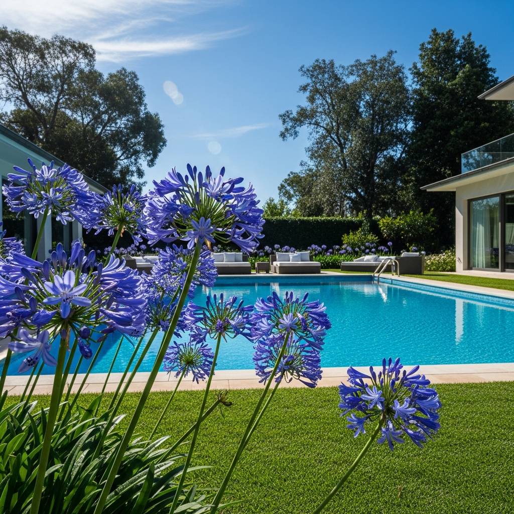 Los agapantos son las flores del verano por excelencia. Sus varas altas con flores azules o blancas son muy elegantes y se ven muchísimo en los jardines del norte de España y Cataluña. Me gusta plantarlos en grupos grandes rodeando la escalera de entrada a la piscina. Son plantas resistentes que aportan una estructura muy limpia y sofisticada a cualquier espacio exterior.