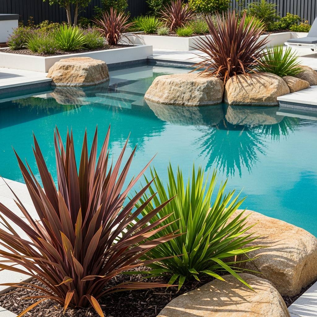 Los Phormium tenax o linos de Nueva Zelanda son geniales para añadir colores rojizos, bronce o variegados sin necesidad de flores. Sus hojas en forma de espada dan un toque muy arquitectónico. Suelen usarse mucho en jardines de diseño en la Costa Brava. Te aconsejo combinarlos con piedras grandes para crear un rincón con mucha fuerza visual que destaque junto a la lámina de agua.