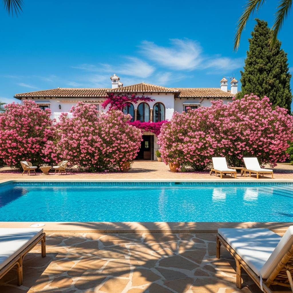 Para darle una explosión de color a la zona de baño, nada supera a la buganvilla. Me gusta verla trepando por los muros blancos que suelen rodear las piscinas en las Islas Baleares. Sus tonos fucsias o naranjas vibrantes crean un contraste lleno de energía. Solo ten en cuenta no ponerlas demasiado cerca del agua para evitar que los pétalos caigan constantemente dentro del vaso de la piscina.