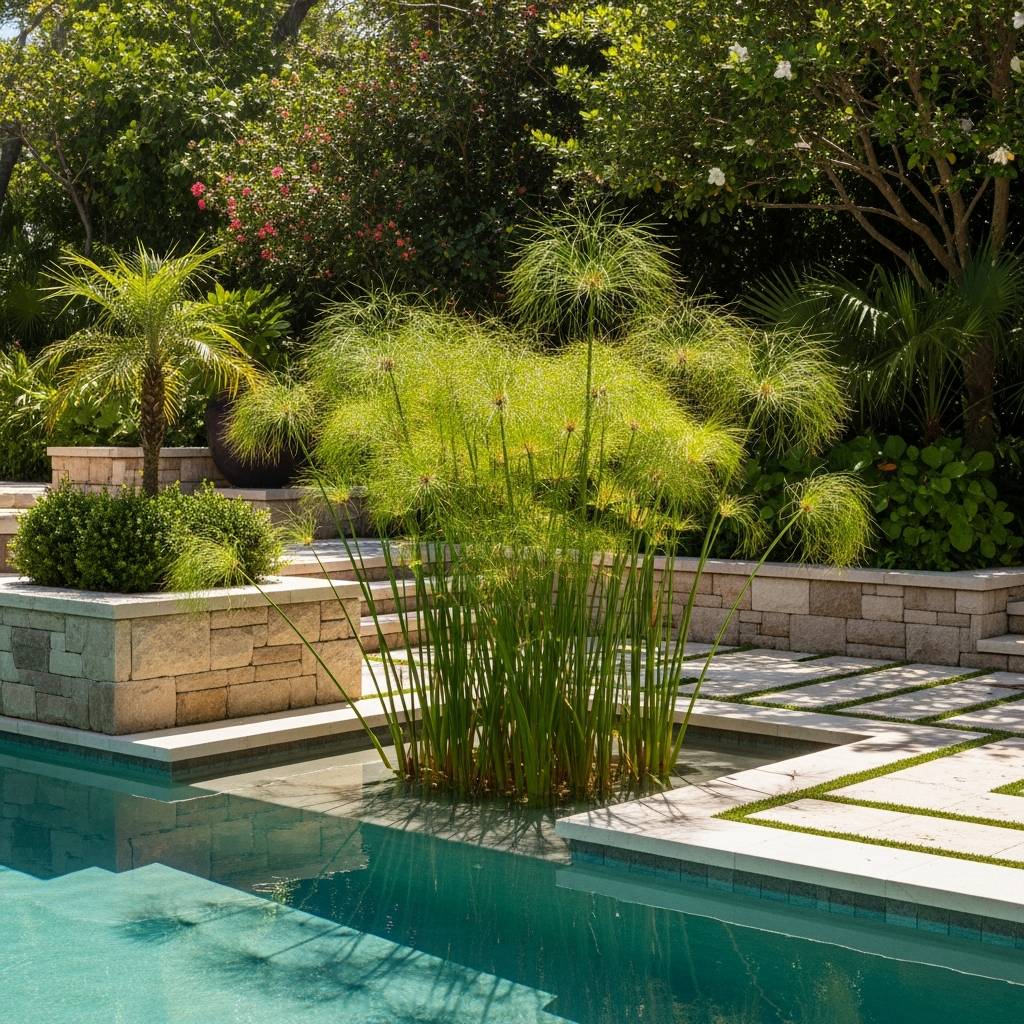 Si tienes una zona de piscina que conecta con alguna pequeña fuente o estanque, los papiros son ideales. Aportan una textura muy diferente con sus tallos largos y sus ‘paraguas’ de hojas en la punta. En casas de estilo más exótico o con influencias árabes en el sur de España, quedan espectaculares porque refuerzan la idea del agua como elemento vital y refrescante.