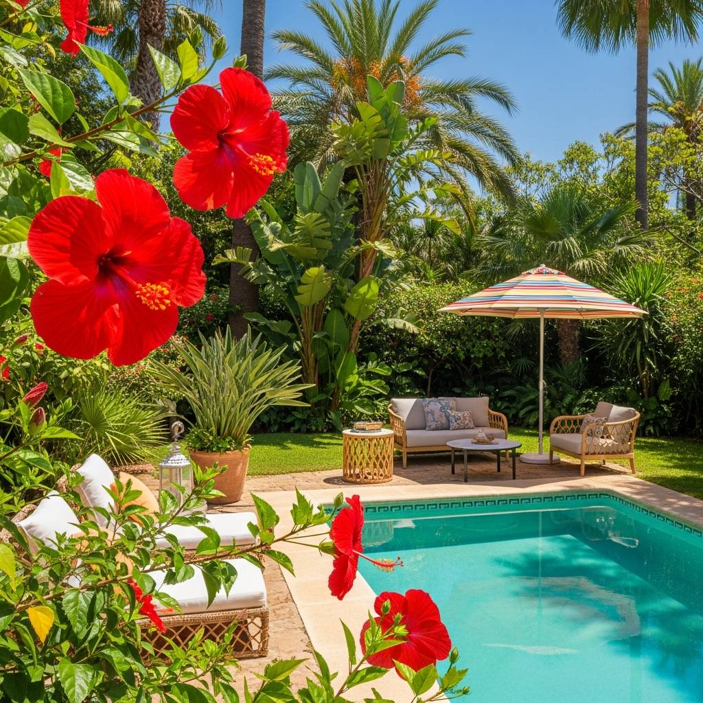 El Hibiscus rosa-sinensis es otra planta que adora el sol de España. Sus flores son tan grandes y llamativas que atraen todas las miradas. Me gusta plantarlos en grupos cerca de la zona de comedor exterior junto a la piscina. Dan una sensación de exuberancia constante y, con un poco de abono y riego regular, te regalan flores durante casi todo el año en las zonas más cálidas.