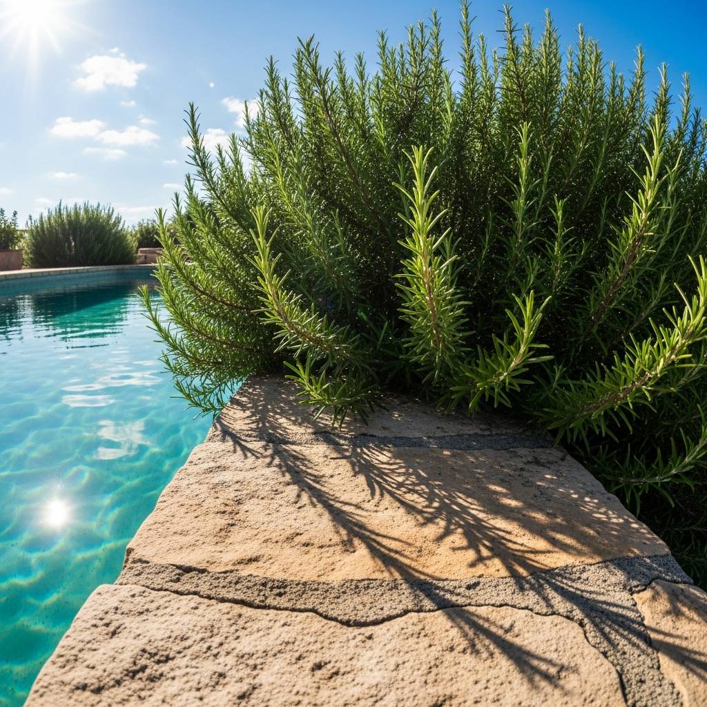 Finalmente, no podemos olvidar las aromáticas leñosas. El romero rastrero es excelente para cubrir bordes de muros o desniveles cerca de la piscina. Es una planta que no pide nada y lo da todo: verde todo el año, flores azules preciosas y un aroma que ahuyenta a algunos insectos molestos. Además, le da a tu zona de baño ese aire auténtico de monte mediterráneo que tanto nos gusta.