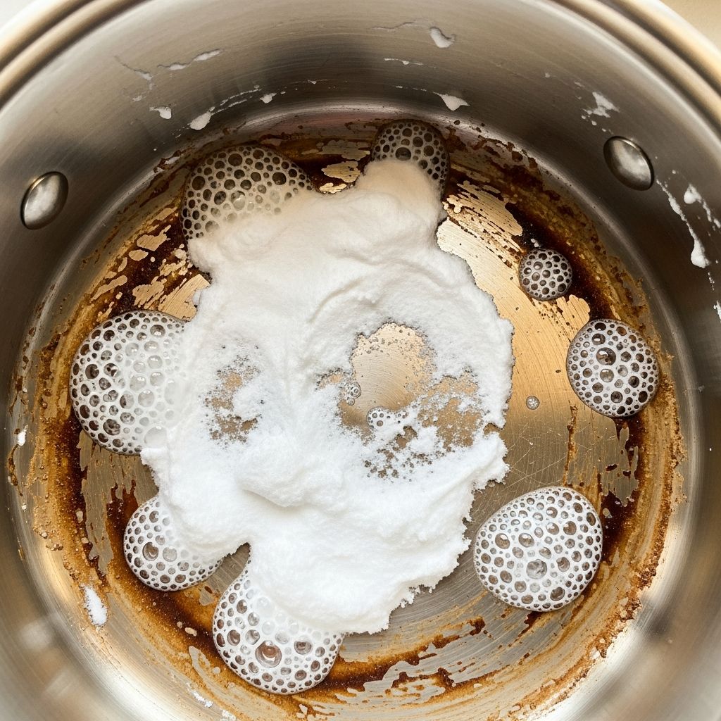 Deja actuar por al menos 30 minutos, o incluso toda la noche si la quemadura es severa. Verás cómo la pasta resultante ayuda a levantar la suciedad. Luego, frota suavemente con una esponja no abrasiva o un cepillo de cerdas suaves. ¡La suciedad se desprenderá con facilidad! Este método es ideal para ollas de acero inoxidable y es seguro.