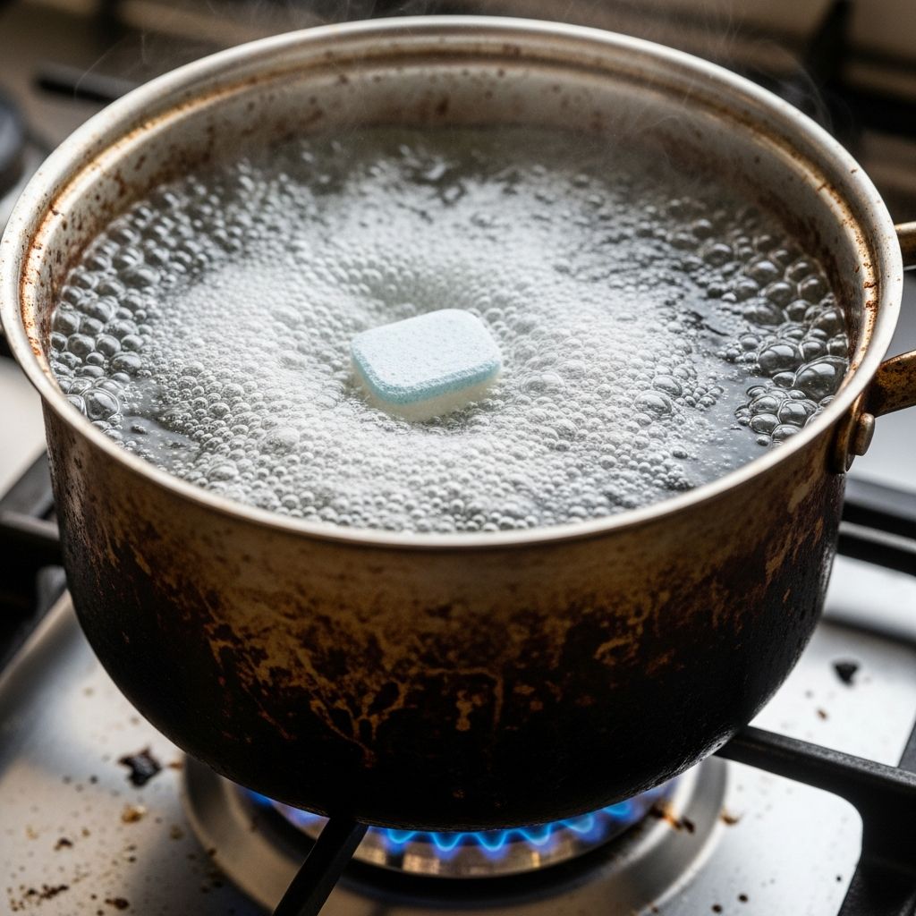 Pon la olla al fuego y deja que hierva suavemente durante unos 10-15 minutos. A medida que la pastilla se disuelve y el agua hierve, los potentes agentes limpiadores harán su trabajo, ablandando y desprendiendo la suciedad. Retira del fuego, deja enfriar un poco y luego vacía el agua. Fregar los restos será mucho más sencillo. Este truco es especialmente útil para ollas de acero inoxidable o materiales resistentes al lavavajillas.