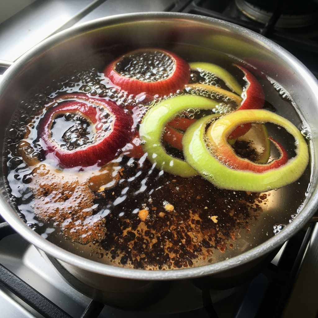 A veces, lo más simple es lo más ingenioso. Si tienes restos de comida muy pegados en el fondo de una olla (no necesariamente quemados, sino simplemente adheridos), puedes usar pieles de manzana. Llena la olla con agua y añade un buen puñado de pieles de manzana. Ponla a hervir a fuego lento durante unos 10-15 minutos.