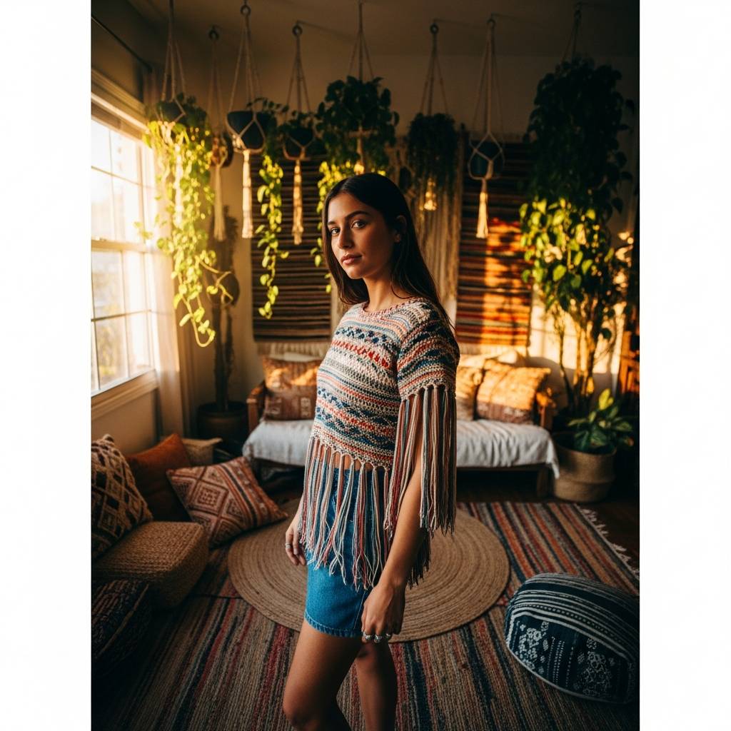 El movimiento es el protagonista en este diseño. Los flecos largos que caen desde la cintura añaden un toque lúdico y bohemio a cualquier conjunto. Es la prenda ideal para combinar con jeans de tiro alto, creando un balance visual perfecto. Al caminar, los flecos crean una dinámica muy especial que resalta el trabajo manual del tejido, haciendo que cada paso sea una declaración de estilo personal.