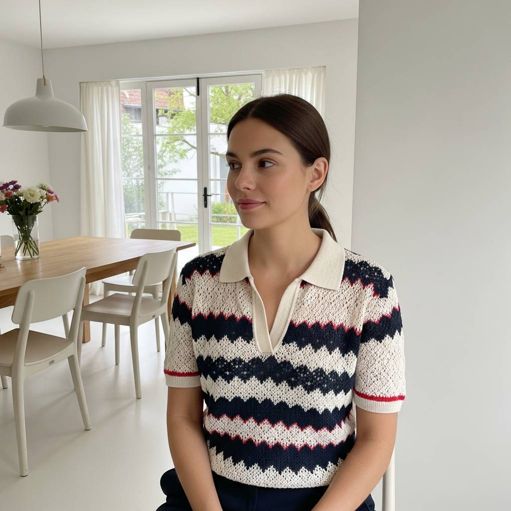 Inspirada en la moda retro deportiva, la blusa tejida con cuello tipo polo es una de las favoritas de la temporada. Combina la formalidad del cuello con la suavidad del tejido de punto, logrando una prenda versátil que funciona tanto para el día a día como para eventos semi-formales. Los botones frontales pueden ser de madera o nácar para reforzar ese aspecto orgánico y natural que tanto buscamos en las piezas tejidas.