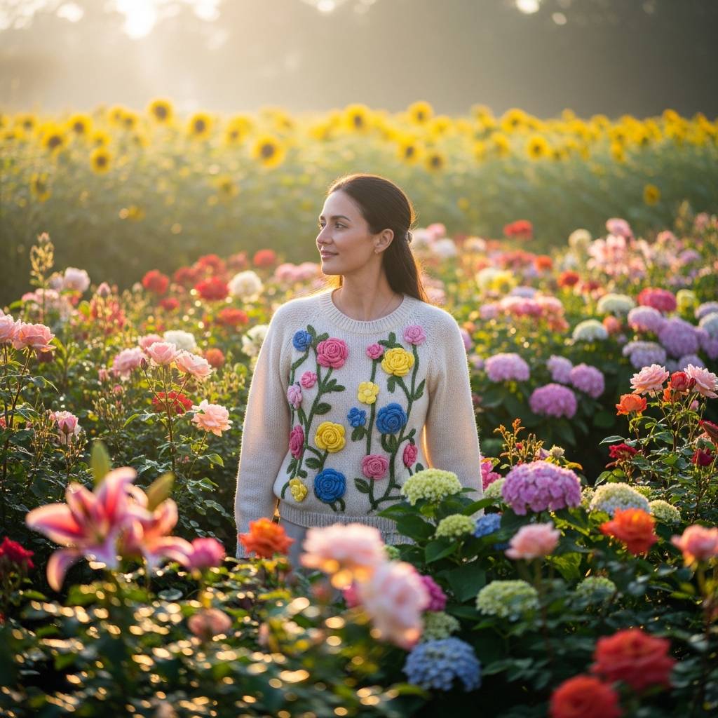 Esta blusa es una verdadera obra de arte textil. Pequeñas flores tejidas en relieve se distribuyen por todo el cuerpo de la prenda o se concentran en el escote, creando un efecto tridimensional encantador. Es la definición de feminidad y dulzura. Utilizar hilos con un ligero brillo puede elevar el diseño para ocasiones especiales como bautizos o eventos al aire libre durante la primavera.