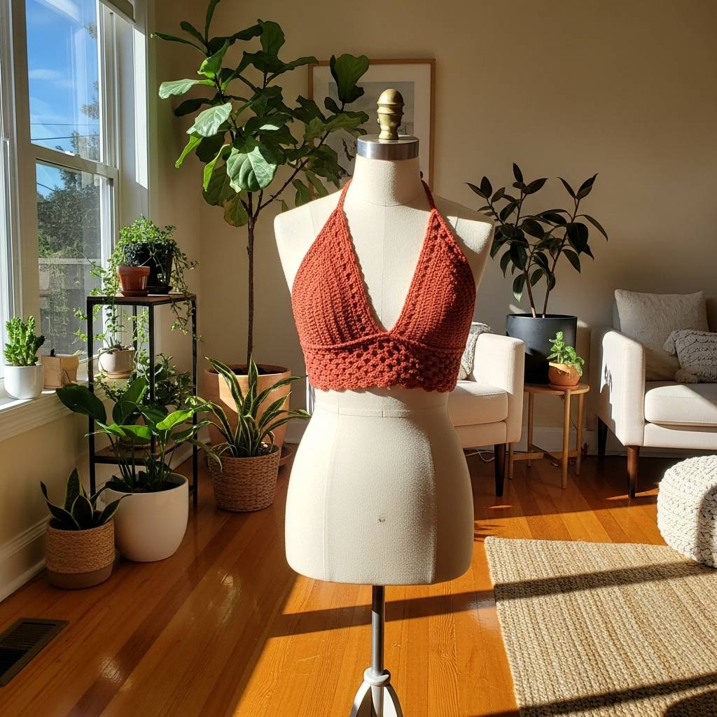 Este diseño es un clásico absoluto que nunca pasa de moda. Me encanta cómo el cuello halter realza los hombros y da una sensación de libertad increíble. Es perfecto para esos días calurosos de festival o para una tarde de relax. Puedes tejerlo en tonos tierra como el terracota o el beige para mantener esa vibración bohemia y natural que tanto nos gusta.