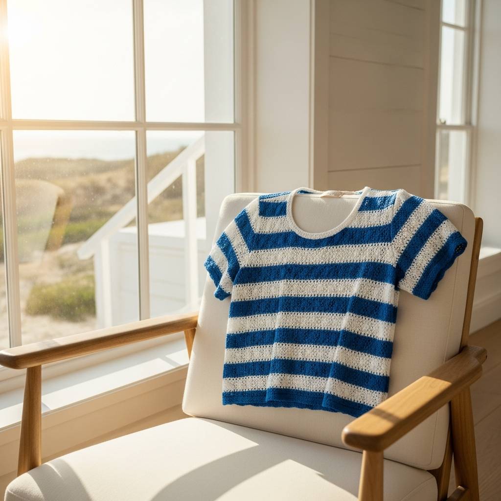 El estilo náutico siempre es un acierto en verano. Tejer un top de ganchillo con rayas horizontales en azul marino y blanco es un proyecto divertido y el resultado es una prenda atemporal. Me gusta mucho cómo queda con unos pantalones blancos de lino; es el uniforme perfecto para las vacaciones sin importar dónde te encuentres.
