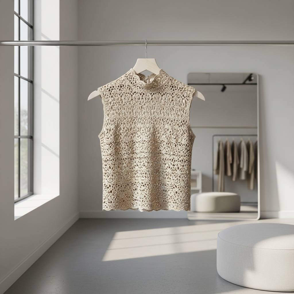 Para un look más pulido y formal, el cuello alto en ganchillo es una opción fantástica. Al no tener mangas, se mantiene fresco pero el cuello le aporta una elegancia que lo hace apto incluso para la oficina si lo combinas con una blazer. Es una de esas piezas que demuestran que el crochet puede ser increíblemente refinado.