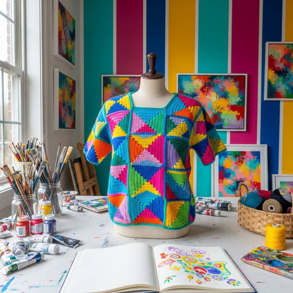 Los cuadros de abuela han vuelto con más fuerza que nunca y yo estoy totalmente aquí para ello. Este top combina diferentes colores en cada cuadrado, creando una pieza vibrante y llena de personalidad. Es una excelente forma de aprovechar restos de hilo que tengas por casa y el resultado es una prenda divertida que se convierte en el centro de cualquier outfit.